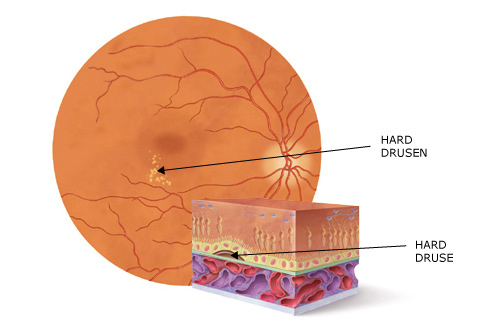 Die Makuladegeneration ist eine Erkrankung, die die Netzhaut oder die Aderhaut betrifft. Sie führt häufig zu einer Neubildung von Blutgefäßen oder zur Ansammlung von Flüssigkeit im Bereich der Makula – der zentralen Zone des schärfsten Sehens. Erste Anzeichen können Ablagerungen in der Nähe der Makula sein, sogenannte harte Drusen. Die Erkrankung verursacht in der Regel eine deutliche Einschränkung der Sehschärfe, oft mit Verlust der Lesefähigkeit auf dem betroffenen Auge.